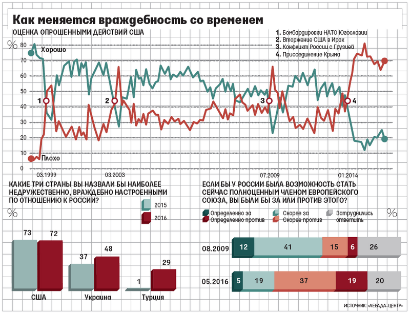 Граждане Российской Федерации считают главными врагами своей страны США, Украину и Турцию. Об этом свидетельствуют данные опроса, проведенного "Левада-Центром".Согласно исследованию, 72% опрошенных считает, что наибольшую враждебность к России проявляют США, на втором месте - Украина с рекордными 48% (в 2015 году этот показатель составлял 37%). Третьей наиболее враждебной страной россияне считают Турцию - в 2015 году так считал 1% опрошенных, сейчас же - 29%. ![]() Фото: Основными противниками жители России считают США, Украину и Турцию (vedomosti.ru) Главные друзья России, согласно опросу - Беларусь (50%), Казахстан (39%) и Китай (34%). Отметим, что Сирия, в свою очередь, за год проделала путь от 2% до 10% одобрения россиян. "Отношение к странам определяется тем, что показывает телевидение, поскольку большинство россиян никогда не выезжали за границу. Ответы на вопросы про рост цен или безработицу - это один уровень ответов, у людей есть в этом опыт, а ответы на вопросы про отношение к США складываются из того, что говорят по телевизору. Чтобы суждения изменились, нужно либо увидеть, как все устроено на самом деле, что почти невозможно, либо чтобы изменилась точка зрения, которую транслирует телевидение", - подчеркнул политолог Дмитрий Орешкин. | |