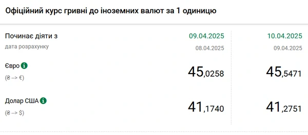 Национальный банк Украины (НБУ) повысил курс доллара к гривне. Единая европейская валюта подорожала на 50 копеек. Об этом сообщает РБК-Украина со ссылкой на данные на сайте регулятора. Официальный курс на 10 апреля 2025 года установлен на таком уровне: 41,2751 гривен за 1 доллар (+0,1011 грн). Официальный курс евро составит 45,5471 гривен за 1 евро (+0,5213 грн).