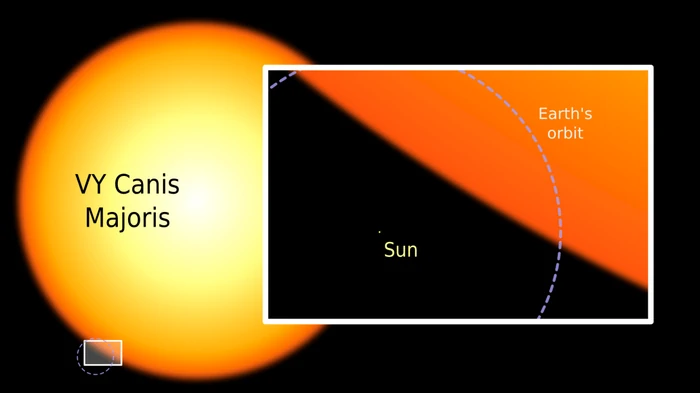 Есть несколько кандидатов на звание самой большой звезды во Вселенной. Одна из них называется VY Большого Пса. Эта звезда примерно в 1500 раз больше Солнца. Если бы она находилась в Солнечной системе, то ее край был бы расположен почти на орбите Сатурна, шестой планеты от Солнца. Но как может существовать такая огромная звезда? Ответ кроется в физике, пишет Space. Возможно, самая большая звезда во ВселеннойVY Большого Пса – это красный гипергигант, который находится на расстоянии примерно 6000 световых лет от нас. Хотя это одна из самых больших звезд во Вселенной, она не является самой тяжелой. Масса этой звезды примерно в 17 раз больше массы Солнца, но эта звезда менее массивная, чем самые тяжелые известные звезды, масса которых может быть в 300 раз больше массы Солнца. Но VY Большого Пса значительно больше этих гигантов по диаметру. Дело в том, что звезда VY Большого Пса близка к концу своей жизни. В ядрах всех звезд происходит термоядерный синтез водорода, что приводит к появлению гелия. Чем старше становятся звезды, тем больше накапливается гелия. Он заставляет реакции термоядерного синтеза происходит все быстрее и быстрее. Прямо перед тем, как звезда вступит в фазу конца своей жизни, в ядре накапливается так много гелия, что синтез водорода перемещается в оболочку вокруг ядра. В результате этого термоядерного синтеза выходит огромное количество излучения, которого так много, что оно давит на остальную часть звезды, что приводит к увеличению ее размера. Это называется фаза красного гиганта. Примерно через 4,5 млрд лет Солнце также станет красным гигантом и его край будет находится на уровне орбиты Земли. Красные гиганты со временем взрываются сверхновыми или же превращаются в белых карликов, но в любом случае так наступает конец жизни звезды. Красные гиганты являются чрезвычайно яркими звездами. Звезда UY Большого Пса вскоре взорвется сверхновой, хотя, возможно, это уже произошло в течение последних 6000 лет. Просто свет от этого события еще не долетел до Земли. Самая тяжелая звезда во ВселеннойЧто касается самой тяжелой звезды в известной Вселенной, то таковой является R136a1, которая находится на расстоянии примерно 165 000 световых лет от нас. Эта звезда всего в несколько раз больше Солнца, но ее масса в 300 раз больше, чем у нашей звезды. Ученые считают, что более тяжелые звезды не могут существовать. Такая масса обусловлена также реакциями термоядерного синтеза. Интенсивность термоядерных реакций определяется массой звезды: чем больше масса, тем выше давление в ядре. Но чем выше скорость термоядерных реакций, тем больше создается излучения, а чем больше излучение, тем больше энергии передается в атмосферу звезды. Имея такую огромную массу ядро R136a1 выпускает столько излучения, что просто сдувает остальную часть звезды. Благодаря своей огромной массе R136a1 является самой яркой из известных звезд. Ее свет эквивалентен одновременному свету 4,5 миллионов Солнц. Из-за того, что звезда R136a1 очень горячая, большая часть ее излучения выходит в виде ультрафиолетового света. Поэтому звезда кажется примерно в 167 000 раз ярче Солнца невооруженным глазом. R136a1 настолько яркая, что, если бы она находилась на расстоянии 40 световых лет от нас, она была бы ярче Венеры. Эта планета является самой яркой после Луны на нашем ночном небе. Если бы R136a1 находилась на расстояни
