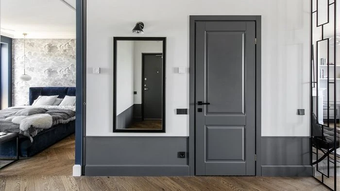 - Контраст зі стінами. Якщо стіни білі чи пастельні, двері можуть бути темними, щоб створити акцент. Якщо ж стіни насичені, краще обрати світлі відтінки сірого.