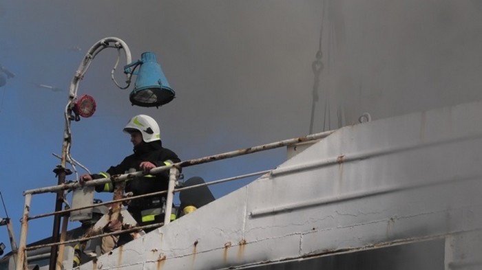 ![]() Фото: ГСЧС Загорелась обзорная палуба корабля, который на момент возгорания находился на ремонте на заводе им. Коминтерна.
