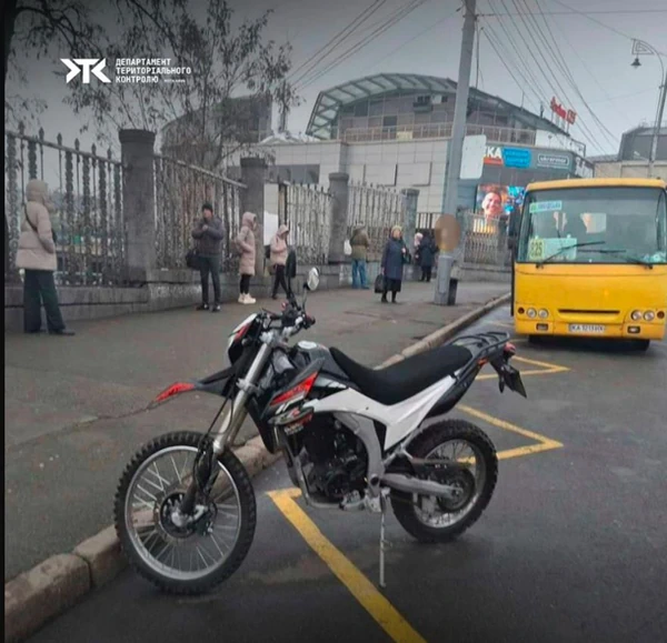 ![]() Фото: Департамент територіального контролю міста Києва Мотоцикл был припаркован на остановке общественного транспорта и мешал работе водителей автобусов и троллейбусов