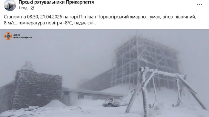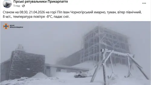 "II уровень опасности, оранжевый", — объяснили украинцам. Подчеркивается, что "заморозки будут причинять вред раннецветущим плодовым деревьям". Где температура упала до -8°C и насыпало снегаСогласно информации горных спасателей Прикарпатья (обнародованной в Facebook), на горе Поп Иван Черногорский — по состоянию на 08:30 21 апреля 2026 года — погода была облачной и туманной. Ветер был северным, со скоростью 8 м/с. Падал снег. Между тем температура воздуха составляла -8°С. Исходя из опубликованного фото, одну из самых высоких вершин Украинских Карпат (2028,5 м) уже успел покрыть немалый слой снега. Его можно увидеть как на земле, так и на руинах польской астрономо-метеорологической обсерватории (частично восстановленных для туристических нужд), известных под современным названием "Белый Слон". О снеге в Ивано-Франковской области сообщают также местные паблики. "Большой слой снега накрыл сегодня Ворохту", — рассказали утром авторы Telegram-канала "Івано-Франківськ 24/7". Какую погоду ждать в Ивано-Франковской областиСогласно прогнозу Ивано-Франковского областного центра по гидрометеорологии, в течение суток 21 апреля погода в регионе ожидается облачная. При этом ночью вероятны были заморозки на поверхности почвы (как в городе Ивано-Франковск, так и по области). Днем вероятен небольшой дождь. В горах — с мокрым снегом. Ветер ожидается северо-восточный, со скоростью 7-12 м/с. Температуру воздуха днем прогнозируют такую: