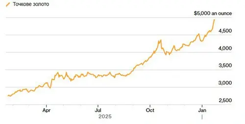 В пятницу, 23 января цена на золото достигла новой вершины — почти 5000 долларов за унцию. Вместе с золотом рекордно подорожали и другие драгоценные металлы. Об этом сообщает Bloomberg. Какая ценаСегодня стоимость слитков выросла до более 4967 долларов за унцию и демонстрирует недельный рост почти на 8%. Главной причиной стал резкий спад курса доллара, который переживает худшую неделю за последние семь месяцев. Это сделало драгоценные металлы более привлекательными для инвесторов во всем мире. Серебро поднялось почти до 100 долларов за унцию, установив исторический максимум. Платина также достигла рекордного уровня, тогда как палладий показал снижение. По данным Bloomberg, золото подорожало на 0,3%. Серебро выросло на 2,6% — до 98,70 доллара, платина прибавила 0,4%, ранее обновив рекорд на уровне 2690,08 доллара. Индекс доллара Bloomberg остался почти без изменений после предыдущего снижения. Что влияетАналитики отмечают, что золото все активнее рассматривают как защитный актив на фоне роста геополитических и финансовых рисков.